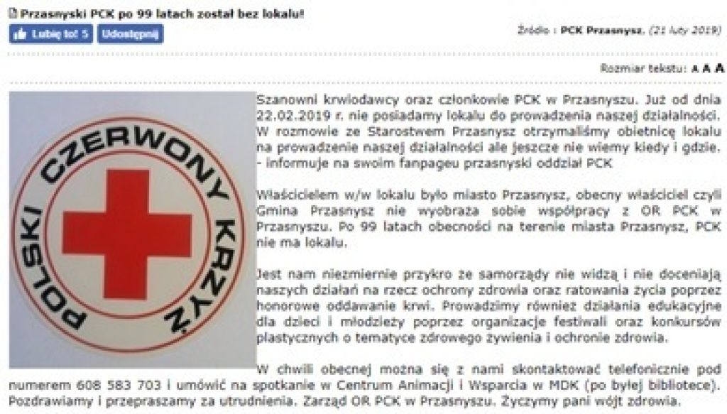 „Ze względu na toczącą się w ostatnich dniach medialną dyskusję na temat siedziby przasnyskiego oddziału Polskiego Czerwonego Krzyża, Wójt Gminy Przasnysz Grażyna Wróblewska zdecydowała się przedstawić dokumentację związaną z tą sprawą – w tym korespondencję prowadzoną przez Urząd Gminy Przasnysz z oddziałem PCK.