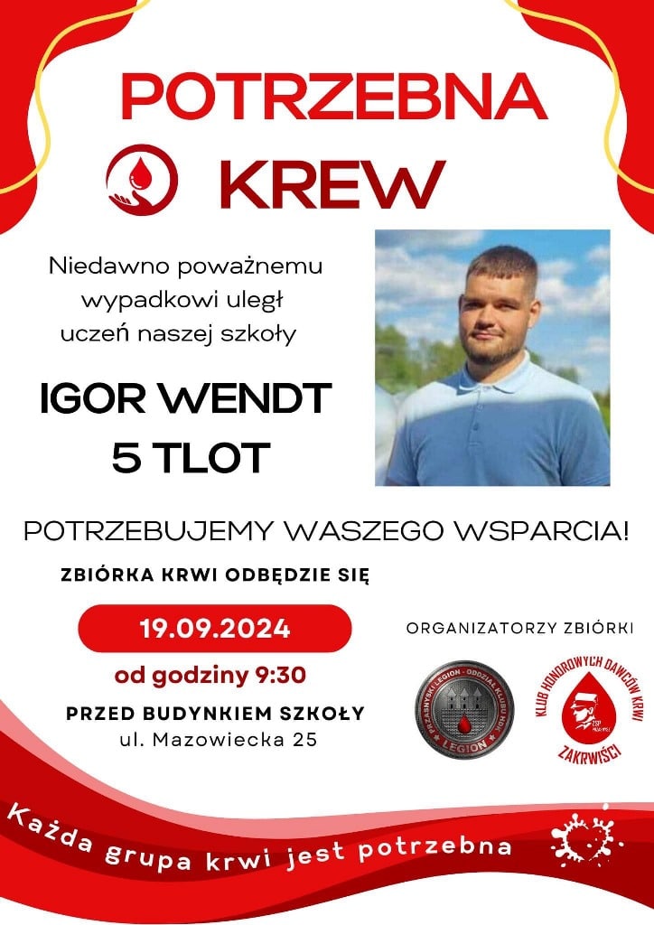 Akcja jest organizowana w odpowiedzi na pilną potrzebę krwi dla ucznia szkoły, Igora Wendt z klasy 5TLOT, który, 15 sierpnia uległ poważnemu wypadkowi komunikacyjnemu. Pomóżmy mu wspólnie! Bardzo zachęcamy do dołączenia do zbiórki krwi.