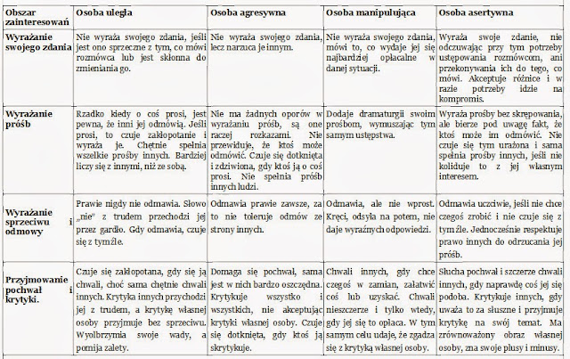 Jak poznać, czy jesteś asertywny/a? Tę umiejętność najłatwiej zaobserwować w sposobie, w jaki wyrażamy swoje zdanie, jak prosimy innych o różne rzeczy, jak wyrażamy sprzeciw i jak reagujemy na pochwały i krytykę. Zapoznaj się z tabelką poniżej i pomyśl, do której grupy należysz. Jeśli nie odnajdujesz siebie w grupie osób asertywnych, pomyśl: co możesz zrobić, aby dążyć do asertywności?